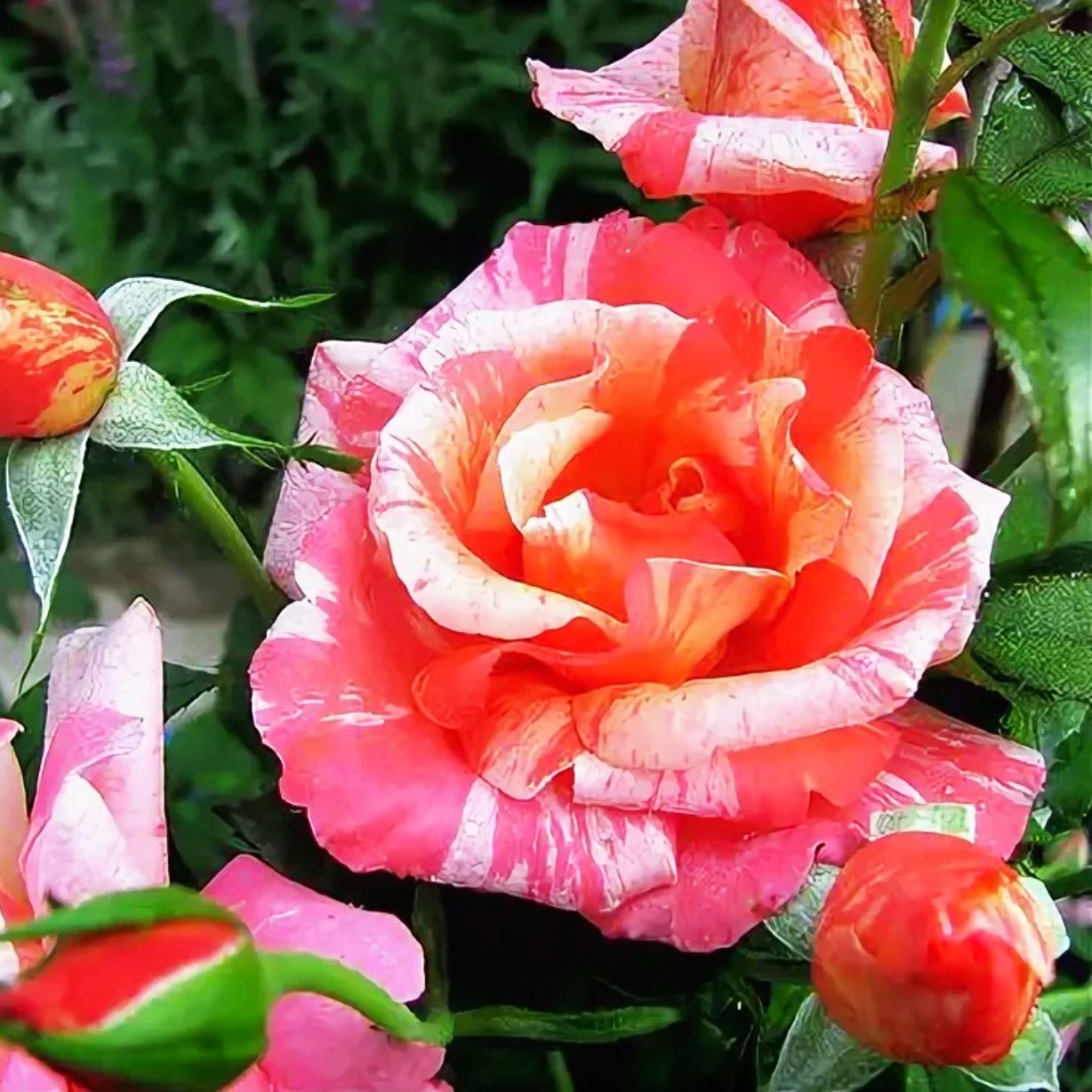 Высота кустов достигает не более 90 см, а диаметр – 60 см. Бутоны изящной формы. Цветки густомахровые (около 25 лепестков), шириной 8 – 9 см. Окраска пестрая: на розовом фоне выделяются желтые и персиковые полоски. По мере раскрытия и увядания бутона границы цвета «размываются». Цветение продолжительное и обильное. Созерцать красоту флорибунды Вы сможете с мая-месяца и до глубокой осени. Роза источает приятный и ненадоедливый аромат.